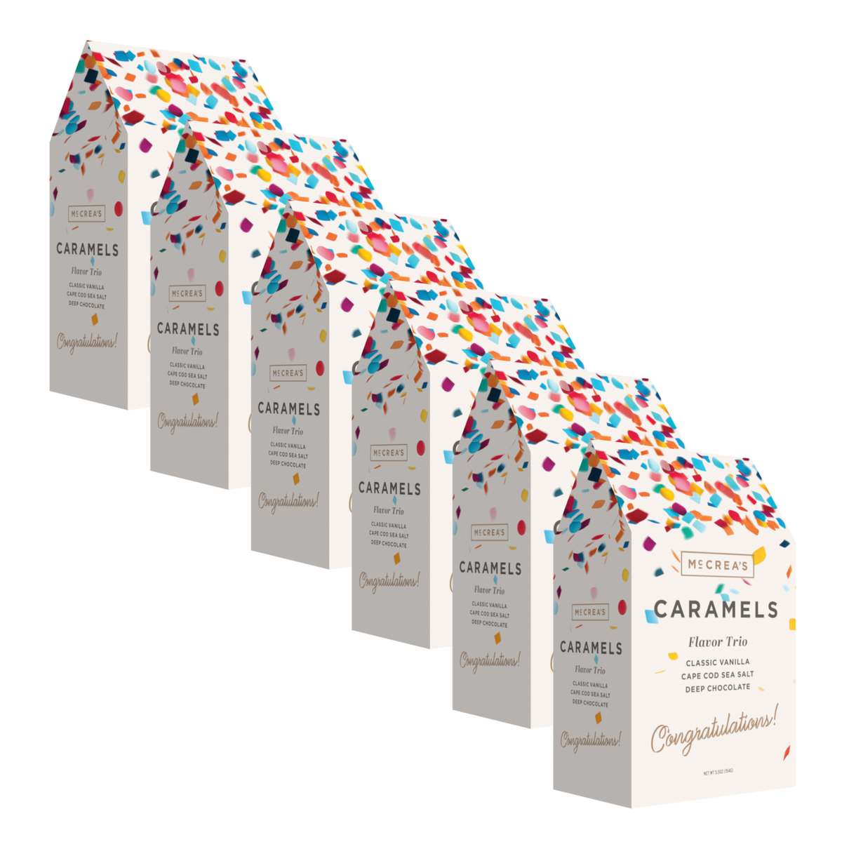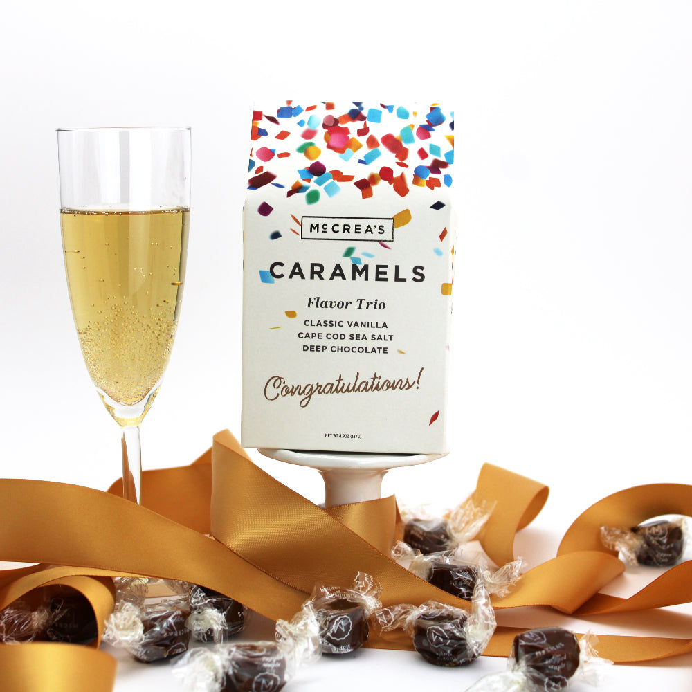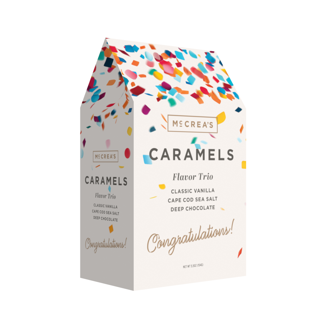 The Congratulations Gable Box is part of McCrea's NEW Greetings Collection and is perfect for special occasions such as Graduations, Showers & Weddings, Retirement Parties, and more. Each box contains 5 pieces each of these favorite flavors: Classic Vanilla, Cape Cod Sea Salt, and Deep Chocolate. 15 individually-wrapped pieces of caramel in all.