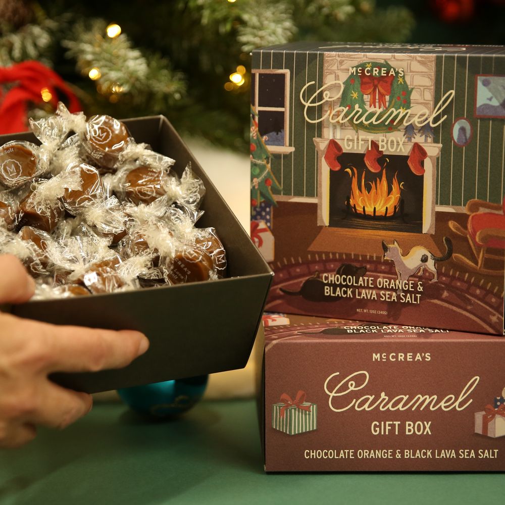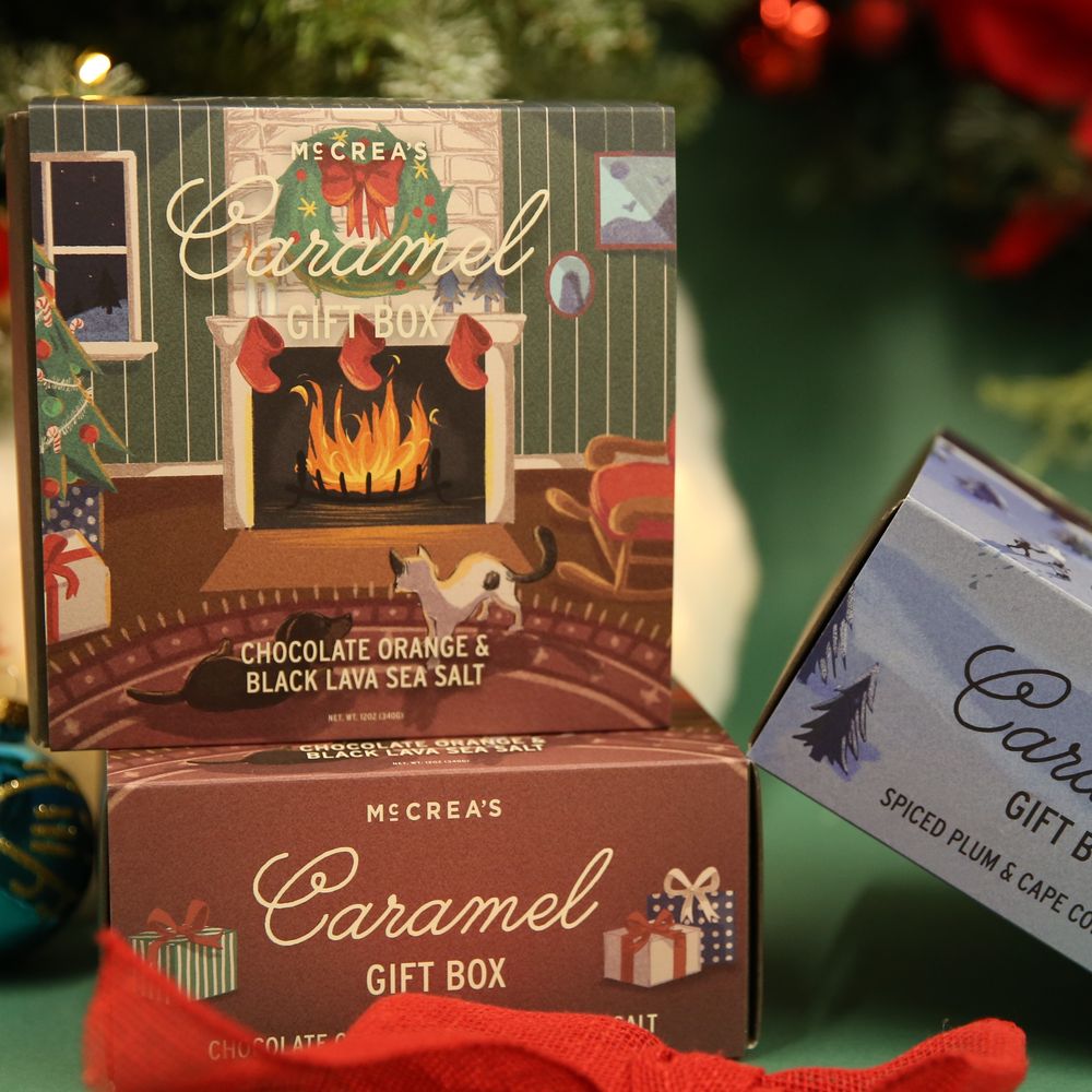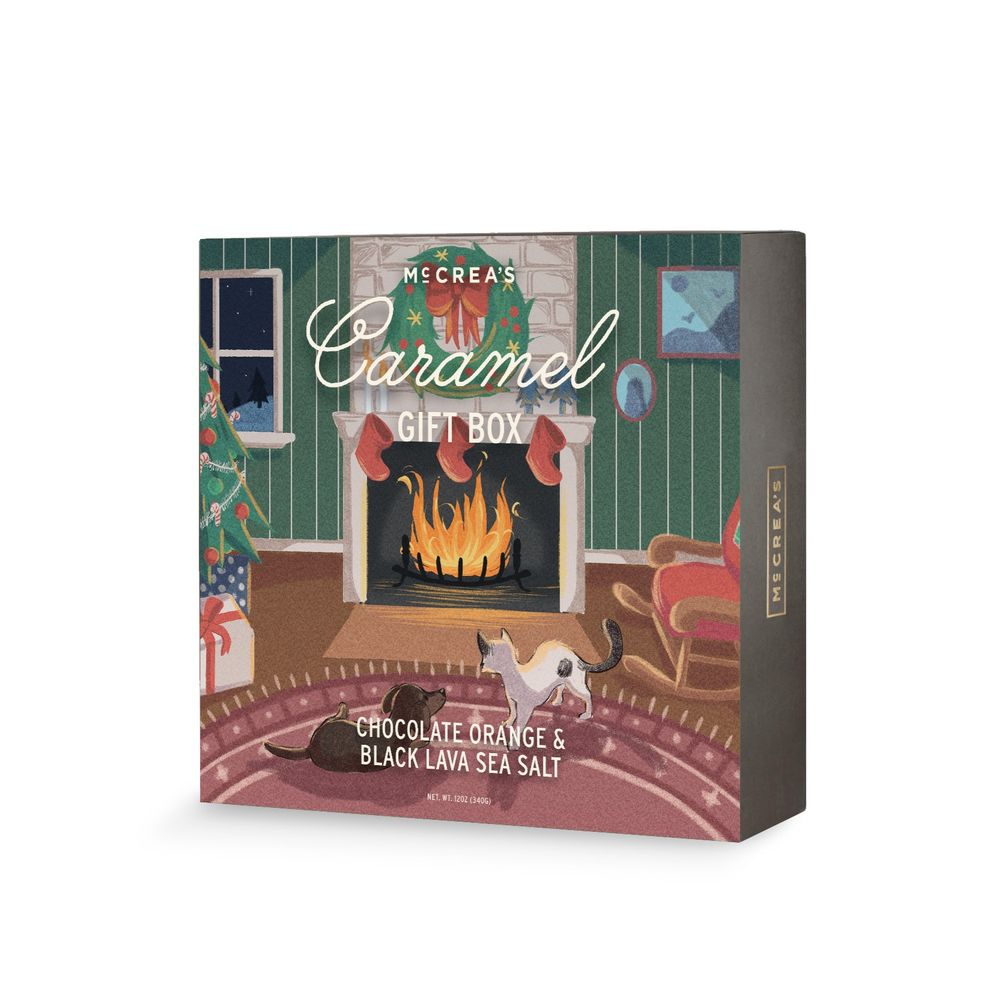 Our Cozy Gift Box contains 20 pieces of McCrea’s Candies best-selling Black Lava Sea Salt caramel and 20 pieces of our Chocolate Orange caramel. Boston artist Angellize Rivera created this beautiful illustration featuring the warm glow of a crackling fireplace and our favorite loyal companions lounging hearthside. The perfect holiday treat for friends and loved ones.